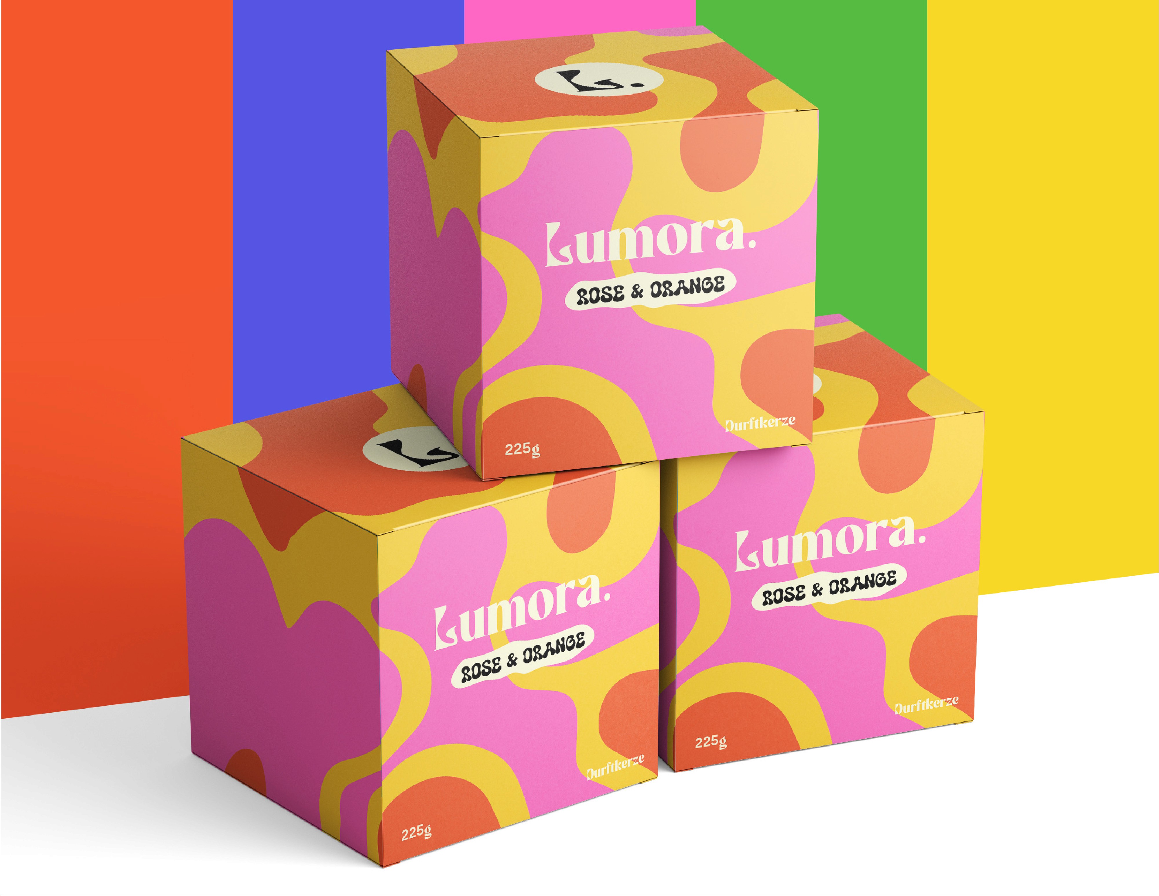 Lumora lebt von Farbe und Bewegung. Knallige, harmonisch abgestimmte Töne und dynamische, wellige Formen prägen das gesamte Design — laut, aber nie chaotisch. Auch die Schriftart fügt sich ein: wellig, dynamisch, fast wie eine flackernde Kerzenflamme oder weiches Wachs. Alles zusammen strahlt Lebensfreude und Energie aus — man sieht es und fühlt es sofort.