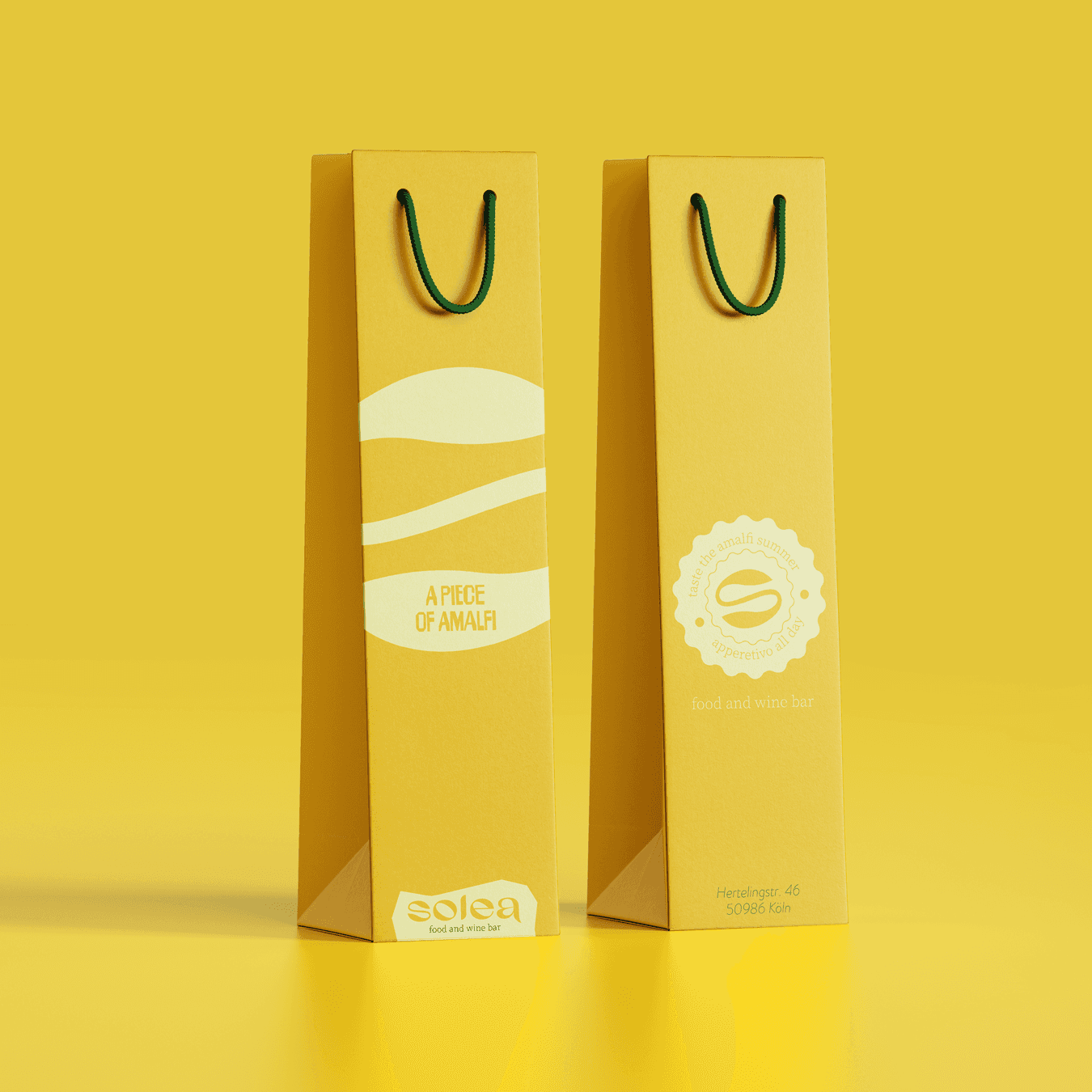 Für Solea wurde ein vollständiges Brand-System entwickelt — von Logo und Farbwelt über Menükarte und Weintaschen bis hin zu Website-Mockup und Tischständer. Die zentrale Idee: Amalfi nicht imitieren, sondern spürbar machen. Die Region hat einen ganz eigenen Charme — nichts ist übermäßig poliert, alles hat eine persönliche Note. Genau das war der Leitgedanke hinter dem gesamten Auftritt.