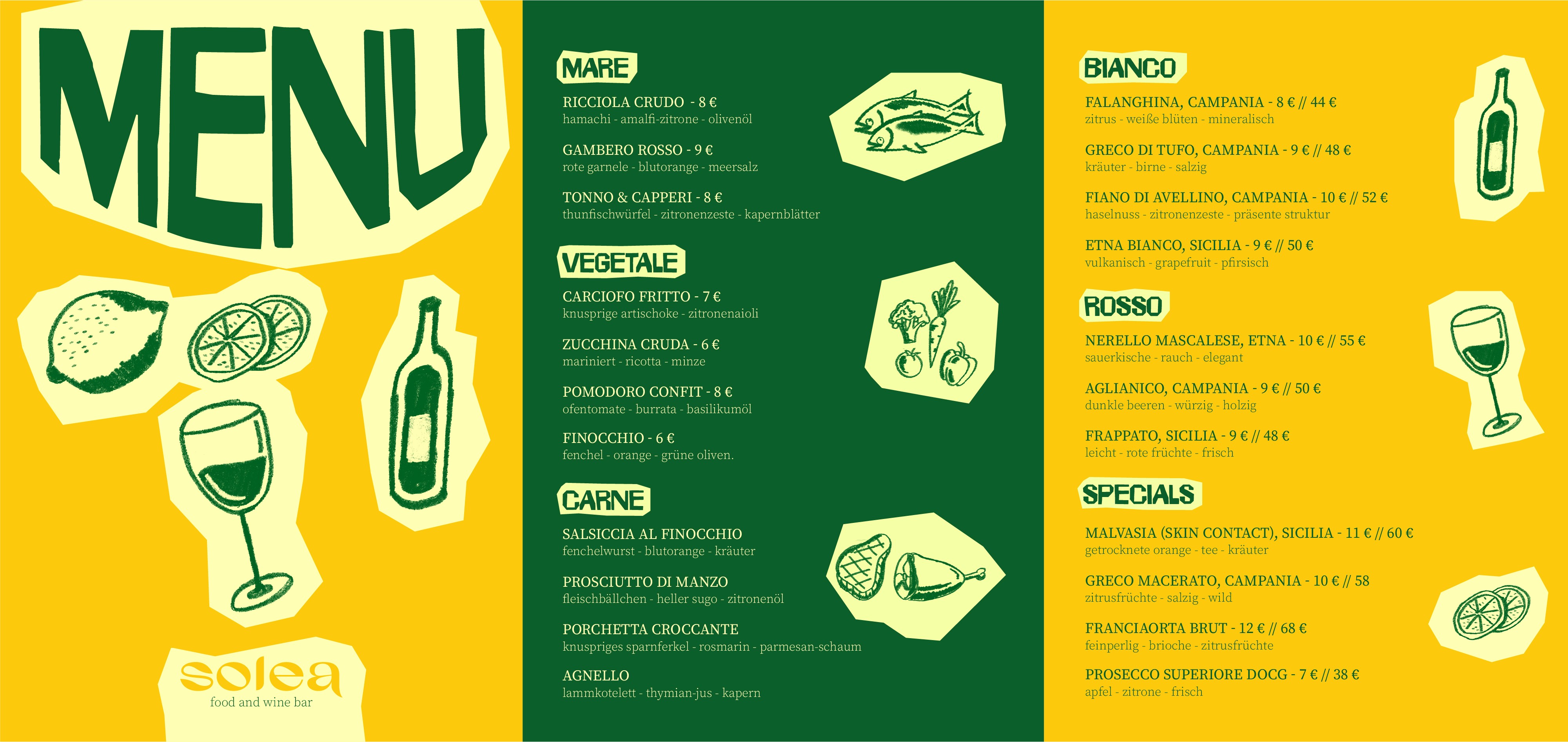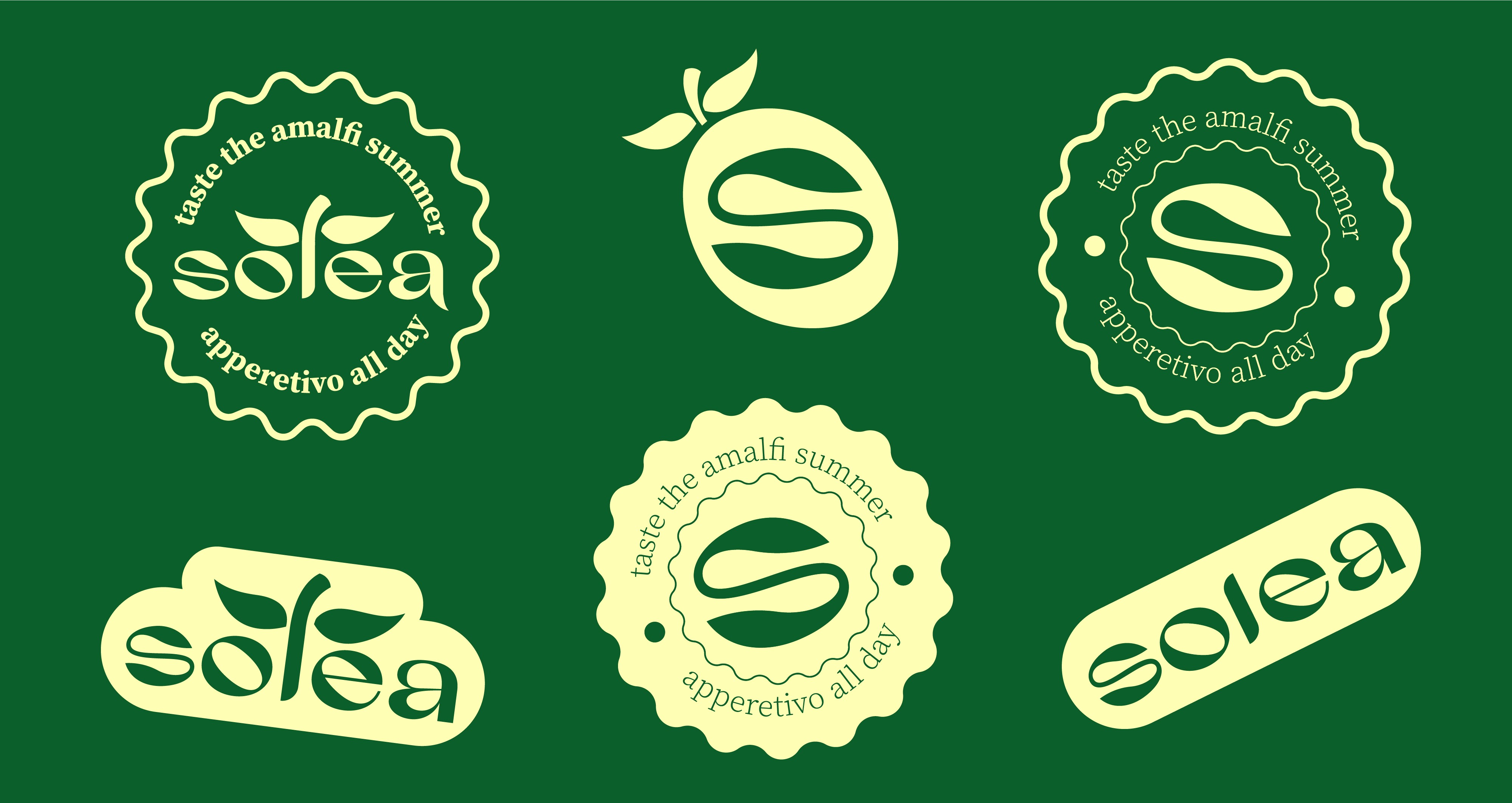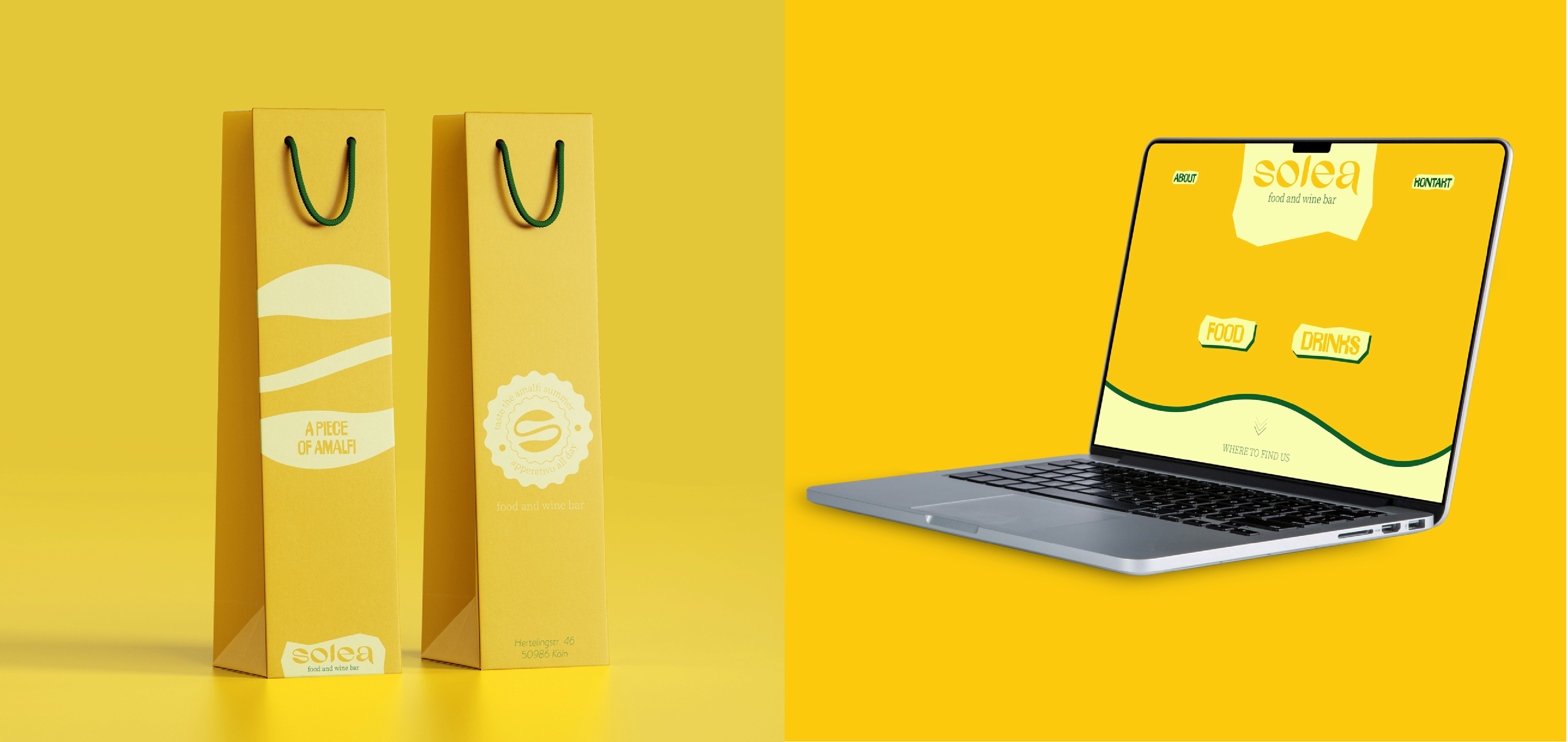 Das Design von Solea lebt von seiner persönlichen Note. Selbst skizzierte Icons und Symbole ziehen sich als Gestaltungselement durch den gesamten Auftritt — sie schaffen Charme und machen das Design unverwechselbar. Das warme Zitrusgelb und das satte Waldgrün sind das Aushängeschild: sie transportieren die Sonne und die Landschaft der Amalfiküste ohne ein Wort zu brauchen. Elegante, weiche Schriftarten treffen auf regellose, verspielte — diese Symbiose aus Gegensätzen ist es, die Solea lebendig macht.