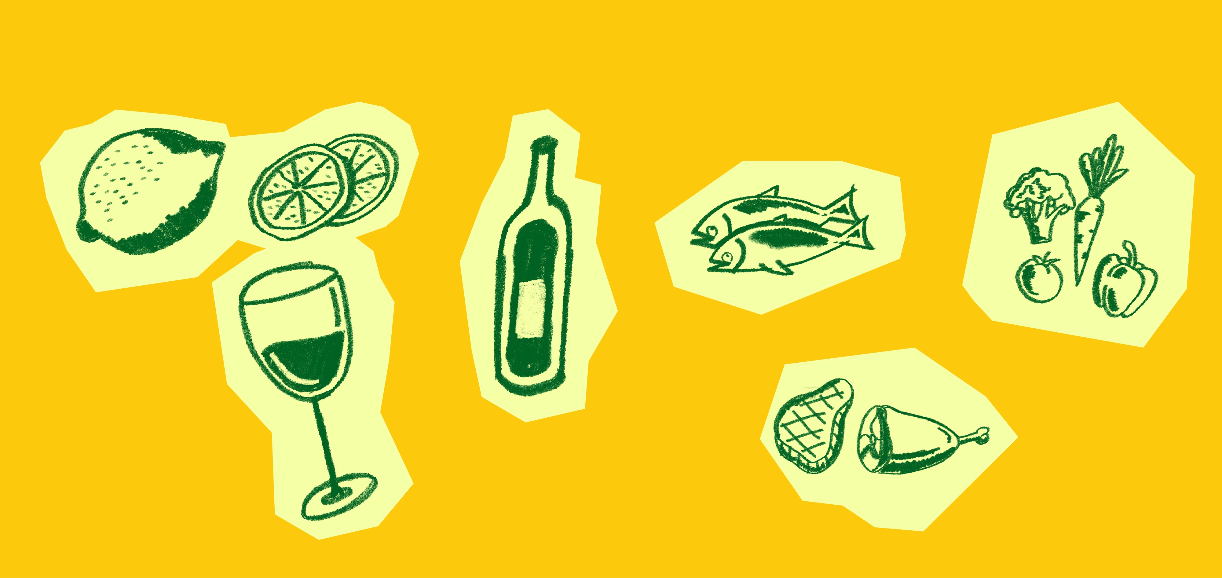 Die handgezeichneten Symbole — Zitronen, Weinflaschen, typische Motive der Region — wurden bewusst skizziert statt digital perfektioniert. Der raue, persönliche Strich ist das Stilmittel: er bringt genau die Wärme und Unperfektion mit, die Amalfi ausmacht.